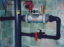 Per il riscaldamento dell'acqua nella piscina o nel idromassaggio esistono diversi sistemi. Il sistema di riscaldamento d'acqua nella piscina più conosciuto e collaudato è quello con lo SCAMBIATORE DI CALORE che funziona con acqua calda dall'impianto domestico o con energia del sole collettori solari (il riscaldamento con collettori solari richiede lo scambiatore di calore di maggiori dimensioni). La fonte di calore per l'acqua della piscina possono essere anche le RESISTENZE ELETTRICE o particolari CALDAIE A GAS. Questo tipo di caldaie riscalda l'acqua della piscina direttamente, senza l'ausilio dello scambiatore di calore (come riscaldatori istantanei). Negli ultimi tempi sono sempre più diffuse le POMPE DI CALORE che offrono diversi vantaggi. Soprattutto per riscaldamento meno costoso, visto che con 1 kW di energia si ottiene 4–5 kW di calore. Le pompe di calore possono anche raffreddare l'acqua durante la stagione estiva, quando la temperatura d'acqua supera facilmente 26—27 °C che durante la caldura estiva ancora permette un rinfresco piacevole. Il sistema di riscaldamento d'acqua (qualsiasi) deve sempre essere integrato nel sistema di ritorno dell'acqua di piscina tramite un by–pass che permette eventuali riparazioni senza dover escludere il filtraggio. Il sistema di riscaldamento adatto è scelto a seconda della richiesta e delle possibilità della stessa piscina.