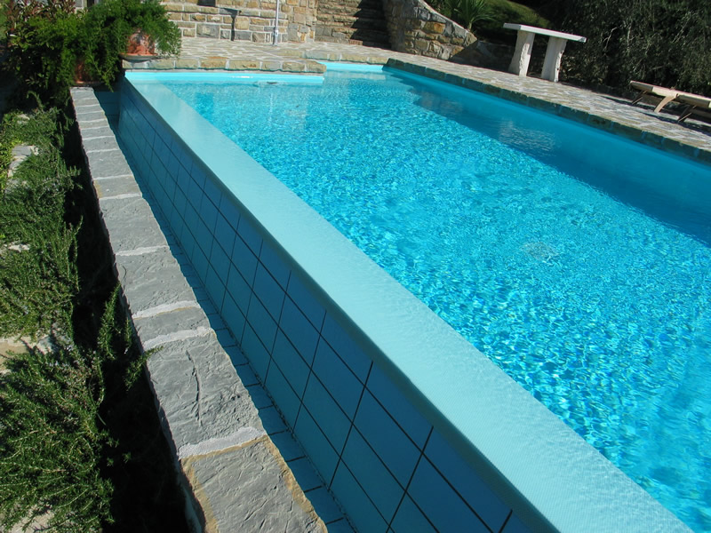 Le piscine in mattoni di polistirolo STIROPOOL possono essere di tipo skimmer oppure a sfioro (vedi anche PISCINA SI', MA QUALE? e COMPONENTI DI UNA PISCINA — DESCRIZIONE).