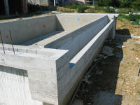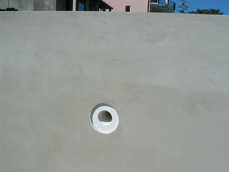Nelle piscine a sfioro, sopra la parete costruita con mattoni Stiropool si costruisce il canale sfioratore in cemento. Questo tipo di piscine per funzionare necessità di una vasca di compensazione che si trova nascosta sul bordo o nel locale tecnico. |