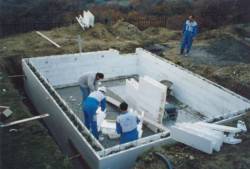 Negli ultimi anni vengono usati sempre più spesso per la costruzione delle pareti di una piscina i mattoni stiropool. Questo tipo di mattoni permette una costruzione veloce e mantiene un ottimo isolamento termico. Con i mattoni STIROPOOL potete costruire le pareti anche da soli. La costruzione delle piscine LINER con i mattoni STIROPOOL ha molti vantaggi rispetto ad altri tipi di costruzione. Usando questa tecnica la costruzione diventa molto più facile di quella classica con cemento. Inoltre la piscina è ben isolata termicamente. Conclusa la costruzione le pareti sono lisce e non hanno bisogno di molti altri lavori. Anche l'isolamento della piscina con uno speciale foglio in PVC dello spessore di 1,5 mm è molto veloce. Il foglio viene posizionato da personale esperto e tutto il processo dura uno o due giorni. La costruzione di una piscina usando questo metodo è molto veloce e semplice rispetto alla costruzione con metodi classici. Le piscine costruite in questo modo hanno 10 anni di garanzia per la resistenza all'acqua.