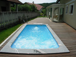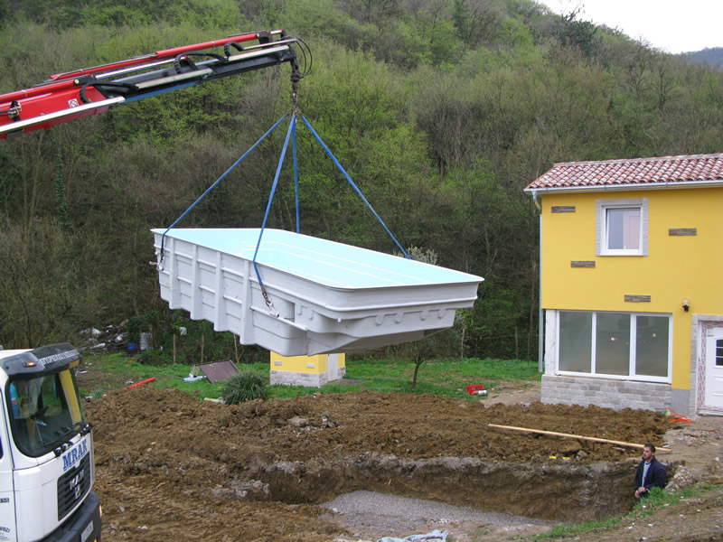 Con il sistema del fai da te la posa di una piscina "monoblocco" potrebbe essere la più semplice, perché non richiede la lunga ed esigente costruzione e la realizzazione del rivestimento finale (con quelle in cemento: mosaico, piastrelle, vernice, con liner: membrana). La piscina prescelta si porta direttamente allo scavo e si posa sula base predisposta (fondo in ghiaia o in calcestruzzo, vedi la pagina www.poliestrski-bazeni.si), dopo di che sulla scocca si installano elementi e si collegano con il sistema di filtraggio. Nel listino per il fai da te abbiamo inserito il prezzo d'acquisto della piscina SWIM TRIM che potete prelevare da noi e trasportare a casa vostra, visto che le dimensioni della piscina permettono il trasporto con qualsiasi camion.