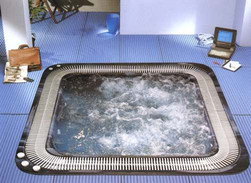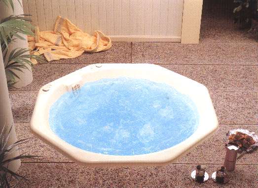 b.) WHIRLPOOL CON IL CANALE DI TRAVASO: (ideali per l'uso pubblico) I Whirlpool con il canale di travaso sono ideali per l'uso pubblico infatti il canale di travaso rende più veloce il cambio dell'acqua tramite i filtri. Funzionano nello stesso modo delle normali piscine con il contenitore di travaso. L'acqua scorre dal canale di travaso nel recipiente di compensazione da dove passando per il filtro ritorna nel whirlpool. Il recipiente di compensazione è fatto in poliestere, la sua capienza è di 1.000 litri ed ha le seguenti misure: 1,63 x 1,22 x 0,78 m. Si possono però costruire anche recipienti in INOX seguendo lo spazio che avete a disposizione. È possibile inoltre ordinare anche speciali costruzioni in metallo per il posizionamento e la livellazione del whirlpool (le misure riportate della profondità dei whirlpool tengono conto anche della costruzione metallica). I prezzi variano tra i 433,00 e i 636,50 EUR per i diversi tipo di whirlpool.