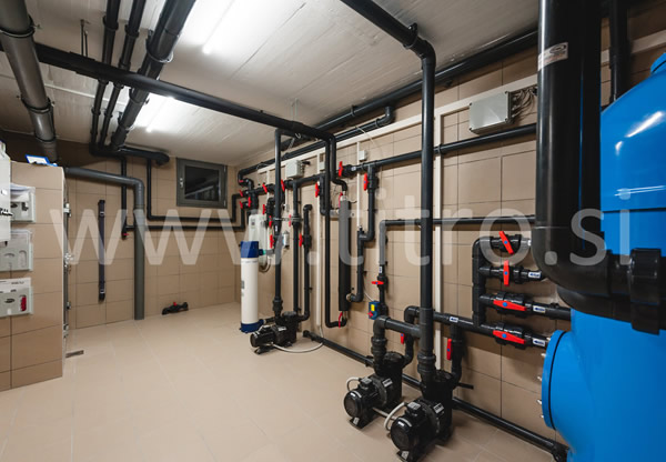 Vsi ključni elementi ( filter, črpalka, 6 potni izbirni ventil, toplotni izmenjevalec, itd... ) so v strojnici tako spojeni, da se jih da kadarkoli demontirati, zato se pri montaži uporabi spojni material, ki omogoča v primeru potrebe hitro demontažo. To so različne deljive spojke ( "holandci" ), ventili itd...
