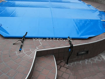 Zategovalne trakove, posebne Inox kline, ki se ugreznejo v tla, elastike za bočno zapenjanje, trak v dolžini dveh dolžin bazena za enostavno pokrivanje bazena in poseben reduktorski navijalec za enostavno odkrivanje bazena