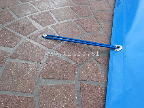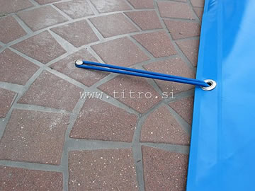 Bočno pa še z elastikami in klini. Za zelo vetrovna območja preko zime priporočamo še dodatno  obtežitev z vodnimi tulci "grip", ali pa dodatno bočno pritrditev pokrivala s cevmi.