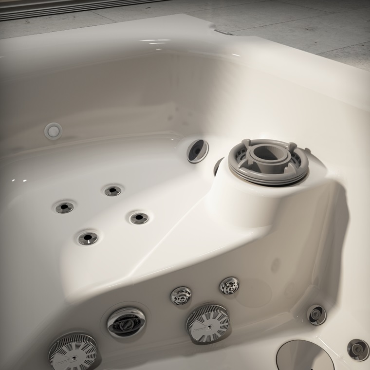 Zahvaljujoč dvema ležiščema in hidromasažnim šobam vgrajenih pod 30° kotom ponuja možnost prave profesionalne vodne masaže in tretma kot ga nudijo pravi wellness centri. In to na samo na samo 2,4 m2 prostora.